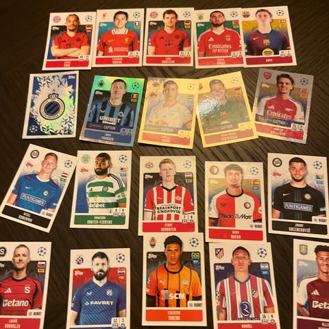Topps Champions League 2024-25 fodboldkort samling bestående af forskellige stickers / klistermærker fra europæiske fodboldklubber. Mærkerne inkluderer spillerbilleder, navne, klublogoer og statistikker. Sammensætningen indeholder både almindelige og specialkort med forskellige designs og farver. Mærkerne er velegnede til samlere og fans af Champions League fodbold.