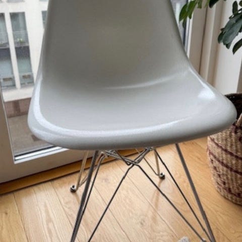 To smukke Eames DSW glasfiberstole - greyish/mokka-farve med flot mørkt træstel i ahorn. Pris pr. stk.: 2200 kr. Begge for 4.000 kr. Kan leveres i Aarhus og Vejle mod symbolsk merpris.
