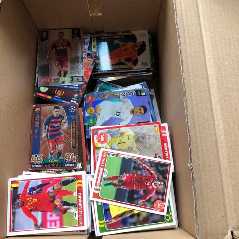Blandt andet Panini FIFA 365 2023-2024, Panini Top Class 2022-23. Topps chrome 2023-24, Panini FIFA score 2013-24. Fodboldkort samling med forskellige klubber og spillere. Kortene inkluderer hold som AC Milan, Chelsea FC, Real Madrid, Atletico Madrid, og flere, med forskellige designs og informationer på bagsiden. Samlingen indeholder både almindelige og særlige kort med spillernavne, positioner og statistikker. Egnet til samlere og fans af europæisk klubfodbold.