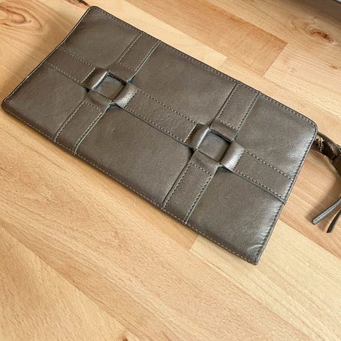Tasken har metalramme med klik-lukning samt aftagelig håndledsrem.