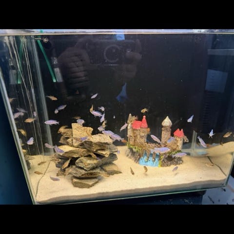 Yngel af maylandia lombardoi, på billedet ses forældre, yngel mellem ca 3-5cm