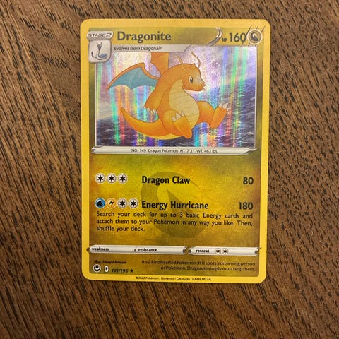 Pokémon Dragonite samlekort med 160 HP. Kortet har angrebene Dragon Claw og Energy Hurricane. Kortet er i god stand og viser karakteren Dragonite mod en baggrund med himmel og hav.