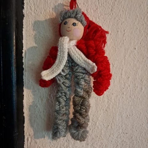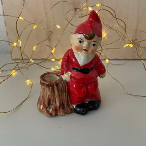 Julegaveide. ældre jule indretning julepynt håndmalet porcelæn nissepige jule pynt julefigur Nisse Pige Julepige med Hvid Forklæde og Rød Nissehue Måler 21cm.