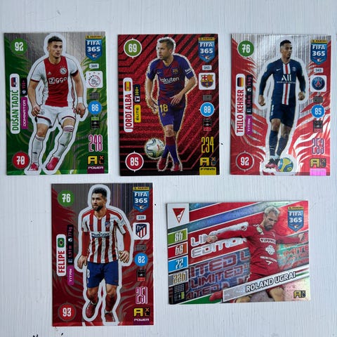 Panini FIFA 365 2023 Adrenalyn XL Limited Edition fodboldkort med forskellige spillere og klubber. Indeholder kort med spillere fra klubber som FC Barcelona, Real Madrid, Ajax, og Bayern München.