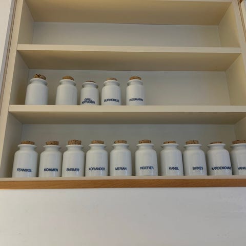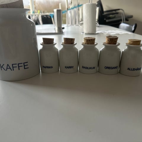 Pris krydderiglas kr. 20,- pr stk og Kaffe, The, Salt og Sukker kr. 75,- pr stk eller kr. 400,- for det hele samlet eller giv gerne et bud :-)