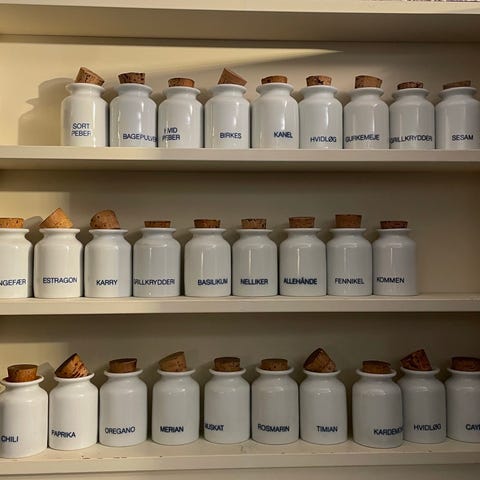 EVA Trio krydderiglas sæt i hvid keramik med korkpropper. Sættet indeholder forskellige størrelser glas mærket til kaffe, te, salt, sukker og flere krydderier. Velegnet til opbevaring af tørre krydderier og ingredienser i køkkenet.
