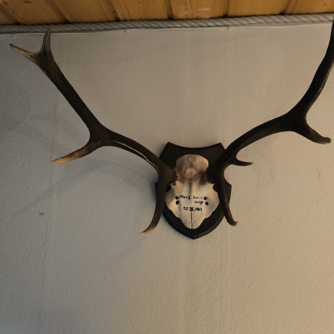 hjorteopsats, gevir, trofæ, jagttrofæ, vægdekoration, hjortegevir, jagt, rustik boligindretning, naturdekoration, gevir på plade, hjortetrofæ, boligindretning, vintage jagttrofæ, 1974, ophæng til julepynt