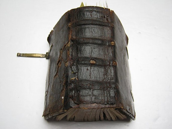Godt... Der er ridser og stødpletter, læder øverst til højre knæ og i højden af den første ribbe nederst, lidt (overfladisk) åbent, ca. 3 cm, indlagt læder inden for rammen på bagsiden løsner sig lidt forneden, hvilket giver overfladiske ridser nederst på bagsiden. To skrevne linjer øverst på titelbladet. Indholdet (let) misfarvet, her og der en plet. Fugtstreg, -plet øverst på sidekanten og/eller øverste margen på omkring 100 sider, blyantstreg i sidekanten på omkring 20 sider, mærkelige noter med blyant i