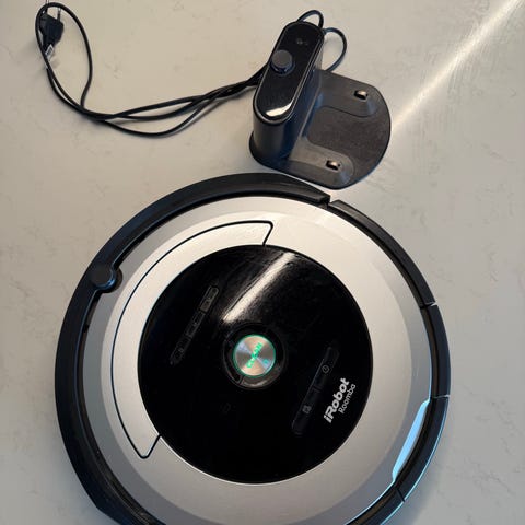 iRobot Roomba robotstøvsuger i grå farve. Enheden har en rund form og er designet til automatisk gulvrengøring. Produktet inkluderer roterende børster og hjul til bevægelse på forskellige gulvtyper. Velegnet til brug i hjemmet til at opretholde renlighed på gulve.