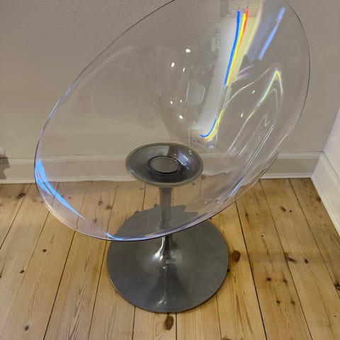 Brugt, med forventelige brugsspor (fx nogle skrammer på sædet som der ikke lykkedes at tage billeder af pga stolens gennemsigtighed)