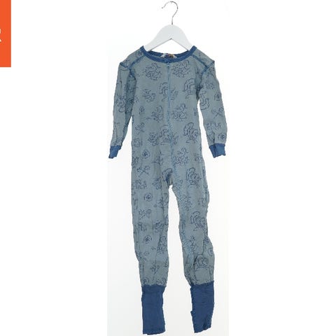 Heldragt til børn med rumfartøjsmønster. Dragten er hovedsageligt i grå med grafik af rumraketter og planeter. Den har mørkeblå kanter ved halsen, håndleddene og fødderne. Dragten har lange ærmer og ben samt en lynlås, der går fra halsen ned til fødderne, hvilket gør det let at tage den af og på.