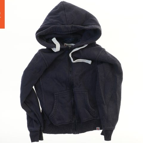 En blå hættetrøje med motiv af en grå bjørn på forsiden. Trøjen har korte ærmer og en integreret hvid langærmet skjorte nedenunder. Den har en hætte uden snore til justering. Det er ikke muligt at identificere mærke eller størrelse fra billederne.