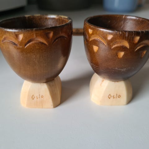 Sælger her nogle Retro Dansk Design Teak træ æggebægre fra TeakWood Denmark