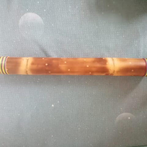 Sælger et flot regnrør (rainstick), håndbygget i bambus med dekorative mønstre.