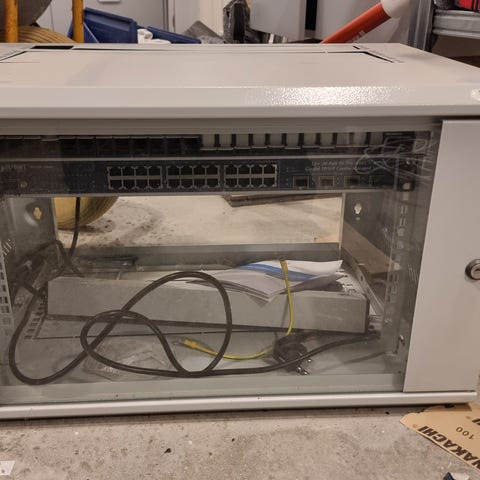 Netværkskomponent i rack-format med flere netværksporte på fronten. Enheden er egnet til brug i netværksinstallationer, f.eks. i mindre serverrum eller netværksskabe. Forbindelserne på fronten giver mulighed for tilslutning af flere netværksenheder.