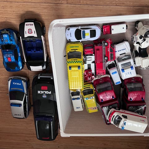 Den blå politibil falder højre baghjul af - så den skal man fixe