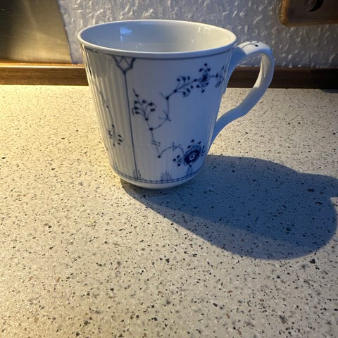 1 stk blå musselmalet (36 cl) med lille afslag på indersiden af kanten foroven : 150,-