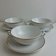 4 stk. bouillonkopper nr 14075 med underkop. 1. sortering. Udgået model. Alt incl. Kan sendes. Mobile pay. Jeg har også 6 små ramakiner og en let skåret sovseskål, hvis det har interesse. Samt flere bouillonkopper uden underkop. De små skåle som anes på fotoet er SOLGT.
