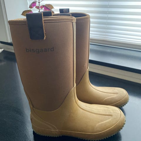 Bisgaard børnestøvler i størrelse 29 til pige med mønster i lilla og beige. Støvlerne er lavet i gummimateriale med en gummisål, der giver godt greb. Stropperne, der burde sidde i ringene bag på støvlerne mangler.