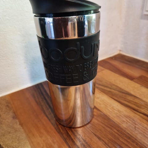 Bodum termokop lavet i rustfrit stål med en blå silikoneholder. Koppen har en låg med drikketud og er designet til at holde drikkevarer varme eller kolde i længere tid. Velegnet til brug på farten eller til kontoret.