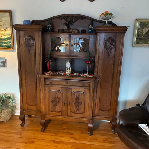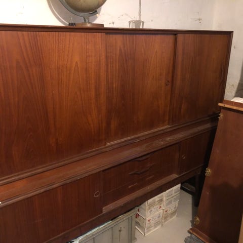 Flot gammel teaktræsskænk med masser af plads. Trænger til en kærlig hånd.