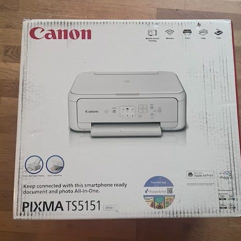 Canon Pixma TS5350 inkjet-printer. En fin printer som udskriver, kopierer og scanner. Virker, men skal have nye patroner (PG-560 og CL-561). Vejledning til trådløs opsætning via router medfølger. Sælges fordi en ny printer er købt. Kan afhentes.