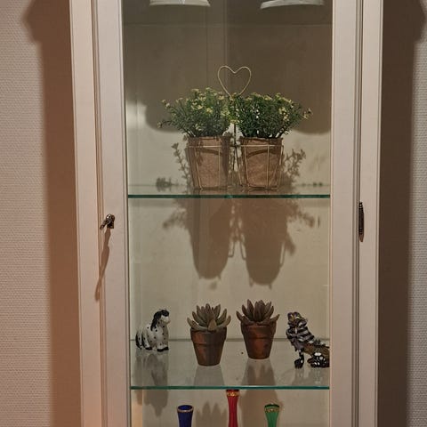 Sælger dette glas vitrineskab for min svigerinde. Det er lidt kantet foran, så der er en skrå side foran. På billedet står der to skabe tæt ved hinanden.