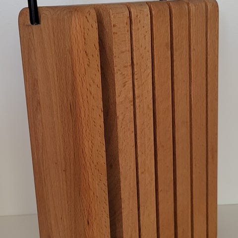 @ Sjælden holder for knive til at stille på køkkenbordet. Den er udført i egetræ og fremstår med brugsspor, samt en løs dut i den ene side som lige skal have en klat lim. Der er tale om et design af Richard Nissen og den er også produceret på Nissen Langaa. Godt dansk design fra storhedstiden.