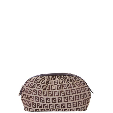 Opdag den klassiske FENDI Zucchino kosmetikpung, fremstillet i det ikoniske Zucchino canvas med det velkendte FF-monogram. Denne taske kombinerer stil og funktionalitet med læderdetaljer og en rummelig læderforing. En sølvfarvet lynlås supplerer designets tidløse elegance.