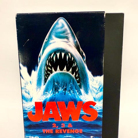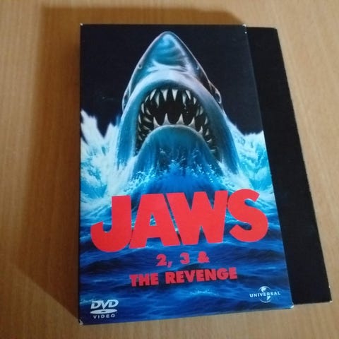 Jaws 3 Movie Box Set containing three movies from the Jaws series. The set includes Jaws 2, Jaws 3, and Jaws 4, featuring shark-themed thriller content. The packaging displays the iconic shark image and movie titles.