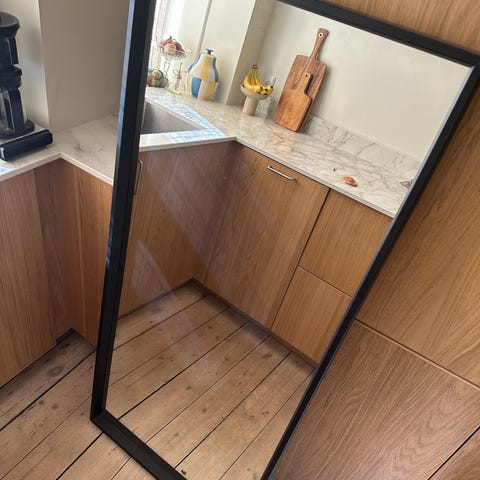 IKEA spejl med sort ramme. Spejlet har en rektangulær form og kan placeres på gulvet eller bordet med støtteben. Materialet er glas og metal. Velegnet til indendørs brug.