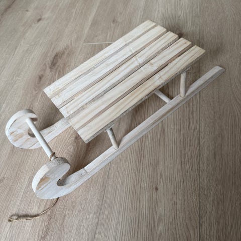 Sødeste slæde med træplade med snemand og understel i sort metal.
