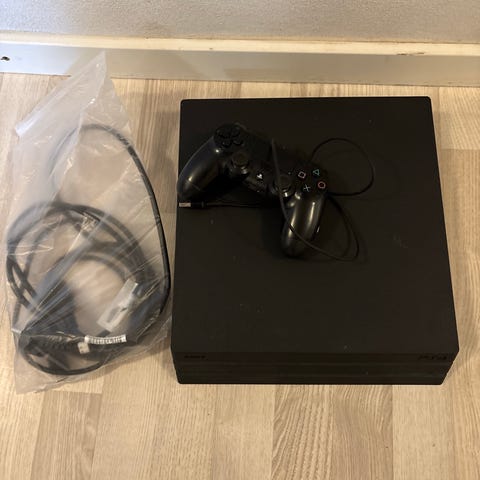 Sony Playstation 4 spilkonsol med en sort trådløs controller. Inkluderer fire spil: Hitman 2, Battlefield, NHL 19 og Red Dead Redemption II. Konsollen er købt i 2020, og er kun brugt begrænset de sidste 3 år, men er i god stand og fungerer helt som den skal.