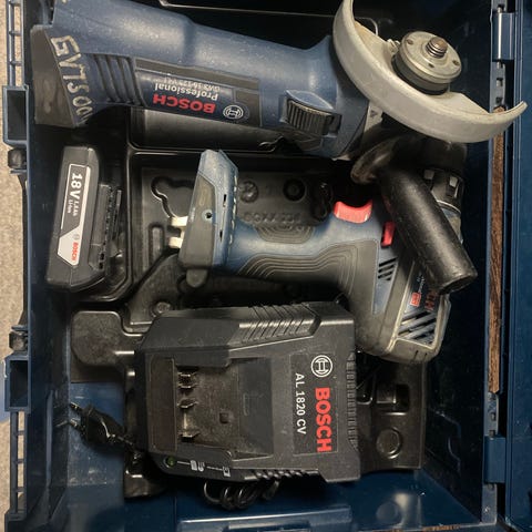 Bosch profesionell skruemaskine og vinkelsliber. U. Batt. Virker fint.