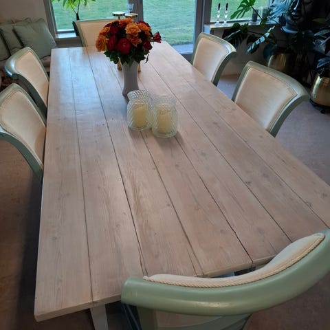 Stort spisebord H77 B100, L225cm kan afhentes i Sønderby mellem Juelsminde og Horsens. Vi har altid haft en voksdug på bordet ellers skal det males op igen.