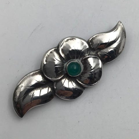 Ornamenteret Jacob Hull Broche i Forsølvet metal med sort sten VI SENDER