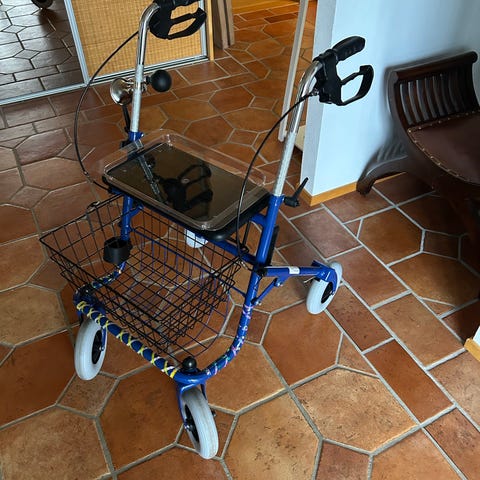 GOD BLÅ ROLLATOR MED HÅNDBREMSE, KURV OG INTEGRERET SÆDE,