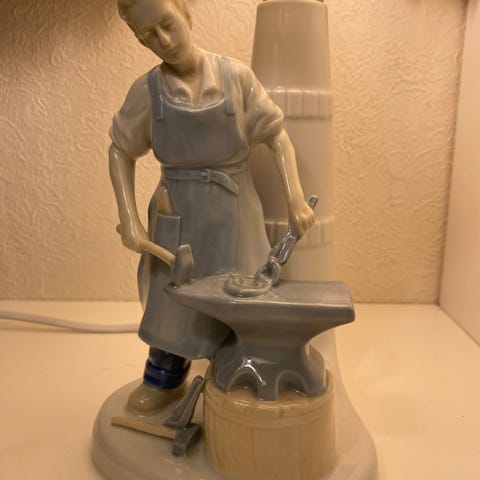 Antik Bordlampe med Hvid Glas og Smedet Metalfod