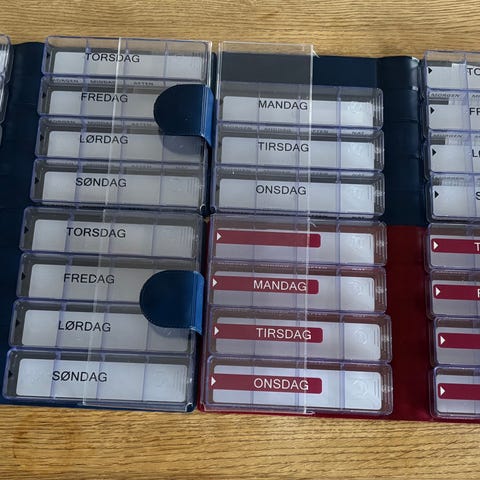 Doseringsæsker til medicin og eller kosttilskud. Med tilhørende taske. Brugt med brugsspor, samt de skal vaske inden brug. Der står ugedage på og delt op i morgen, middag, aften og nat. Sætter indeholder 7 æsker . Således kan man tælle op til en uge af gangen og nemt at have med ud af huset eller ferie.
