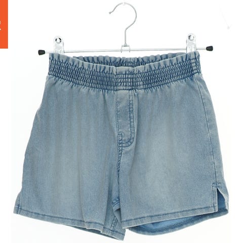 Et par jeans shorts i blå denim. De har et klassisk femlommedesign med to forlommer, en møntlomme og to baglommer. Shortsene har opknappet lukning og er let slidte for en moderne look. Der er et mærke med navnet 'Blue Ridge' placeret på bagsiden.