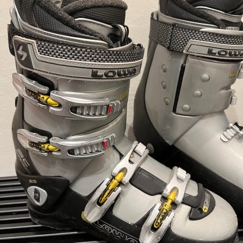 Lowa Incity skistøvler til damer i størrelse 38 (5½). Skistøvlerne er sorte med grå indvendig polstring og har justerbare spænder for tilpasning. Materialet er robust plast med polstret inderside for komfort.