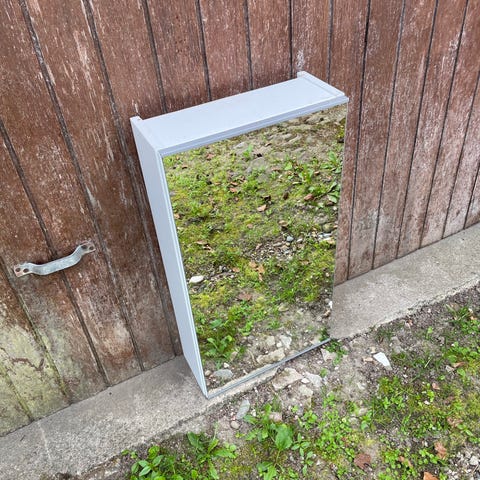 2 spejl skabe med glas hylder . Det smalle skab med 1 låge har som set på billedet en lille revne oppe i hjørnet , men er uden den store betydning . Begge skabe er IKKE pudset . Havde tænkt en pris på det enkel skab 250 kr og dobbelt skabet 500 kr . Men bud modtaget