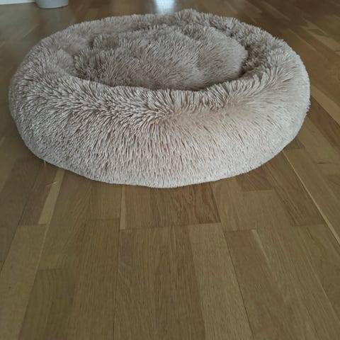 Rund hundeseng med en diameter på cirka 80 cm. Ydersiden er beige og lavet af polyester. Sengen har en sort bund med skridsikre prikker. Der ses slid og mindre skader på lynlås og stof ved åbningen. Egnet til små til mellemstore hunde.