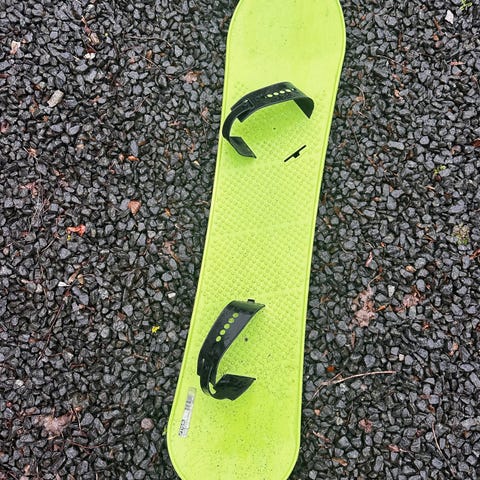 Snowboard med integrerede bindinger i rød og sort farve. Brættet har en grafisk overflade og en slidstærk bund med mønster for bedre greb. Velegnet til vintersport og snowboarding aktiviteter.
