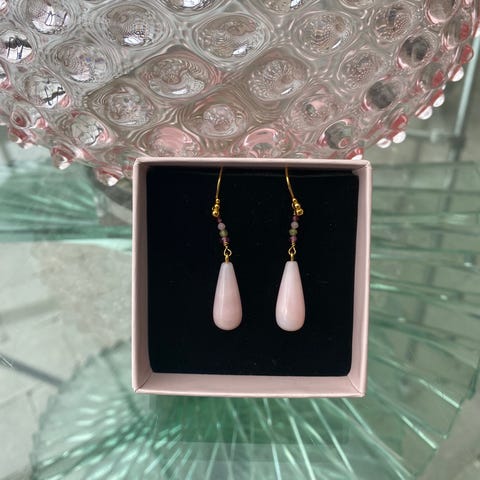 Øreringene har et geometrisk trekantsdesign med perler placeret på hvert hjørne og i midten.