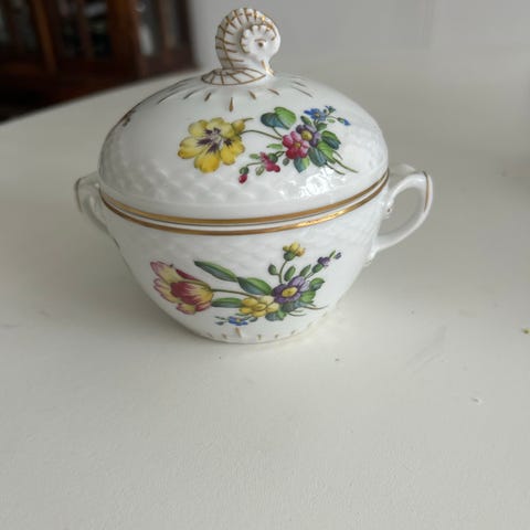 Det er en royal Copenhagen krukke med låg med asiatisk motiv