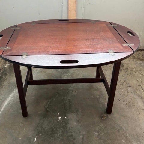 Træbord / Traditionelt Butlerbord i Mahogni med foldbare sider og håndtag, velegnet til alsidig brug som skrivebord eller serveringsbord. Bordet har en rektangulær overflade med en varm træfinish og kan foldes sammen for nem opbevaring og transport. Kan Evt. Leveres