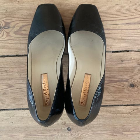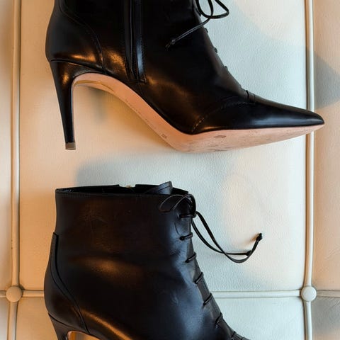 Elegante sorte støvletter fra Rupert Sanderson. Støvletterne har en spids snude og en høj hæl. Detaljer med guldspænder giver et eksklusivt look. Lynlås på siden gør dem nemme at tage af og på. Brugte, alm brugspor, lige som viste på billeder, ingen defekter. Ægte læder.