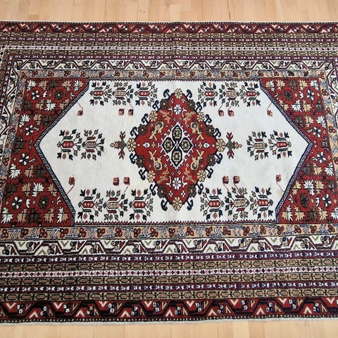 Orientalsk tæppe med traditionelt mønster i røde, hvide og brune/ Sorte nuancer. Tæppet har frynser i begge ender og er velegnet til brug som gulvbelægning i stuer eller soveværelser. Materiale og størrelse er ikke specificeret. Kan sendes/ Evt. Leveres