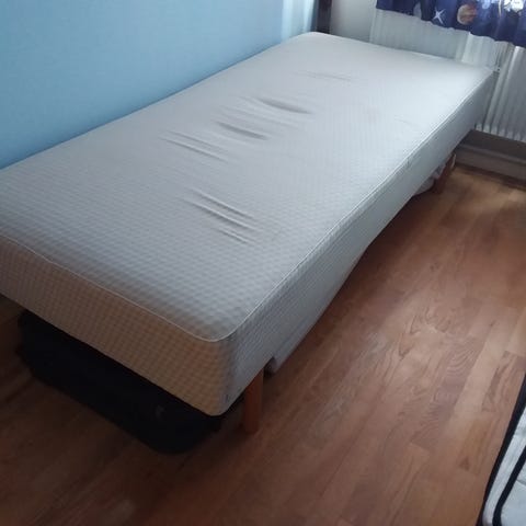 IKEA sengemadras i neutral farve med enkeltdesign. Madras er rektangulær og har en fast overflade inkl hvide træben(slidt), egnet til enkeltseng. Materialet er standard madrasstof, velegnet til daglig brug.